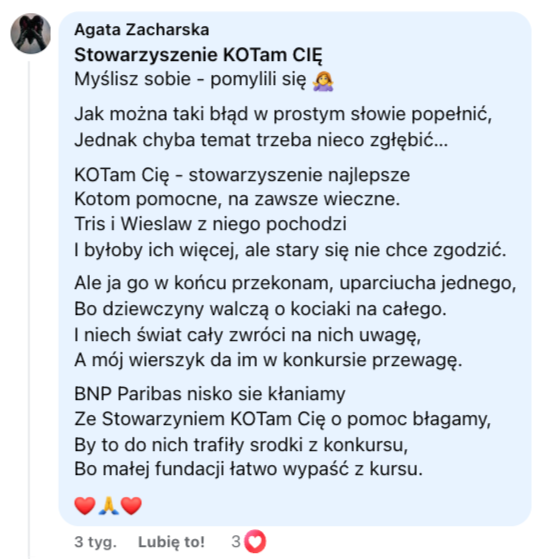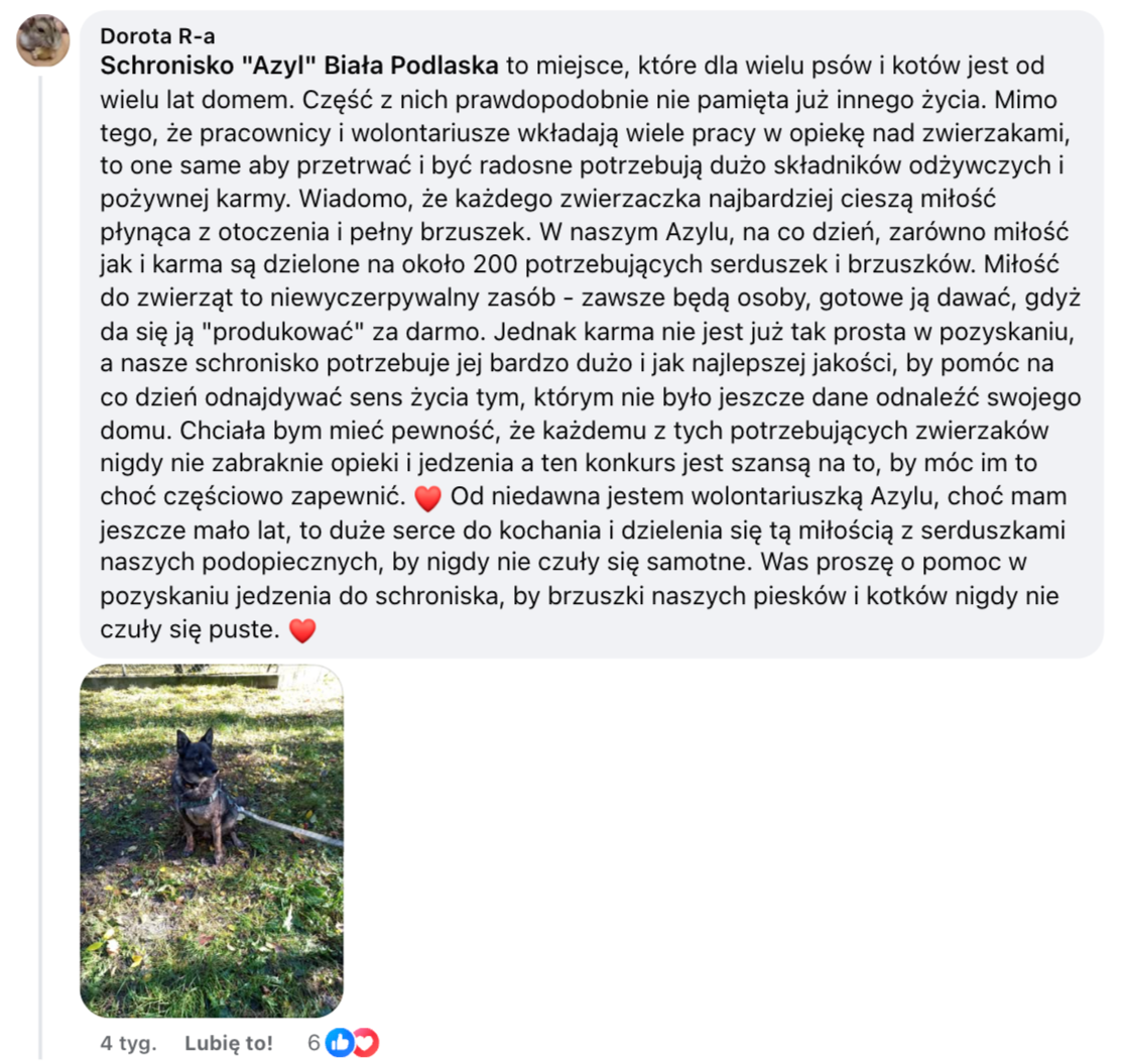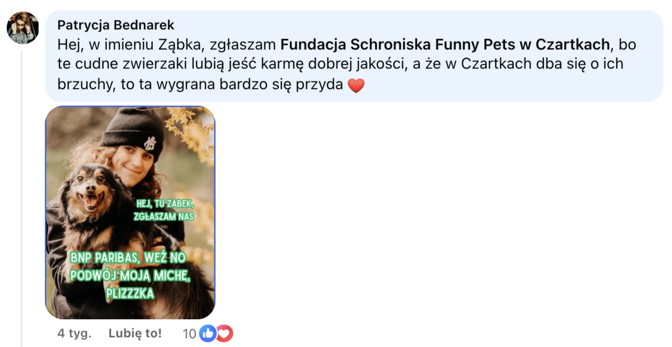 Wiemy, że potrzebujących zwierząt jest w Polsce ogrom, dlatego rozstrzygnięcie konkursu "Podwojona micha" było szalenie trudne. Dziękujemy wszystkim za ogromne zaangażowanie i pokłady kreatywności, a BNP Paribas Bank Polska i Fundacji BNP Paribas za granie do jednej miski!
