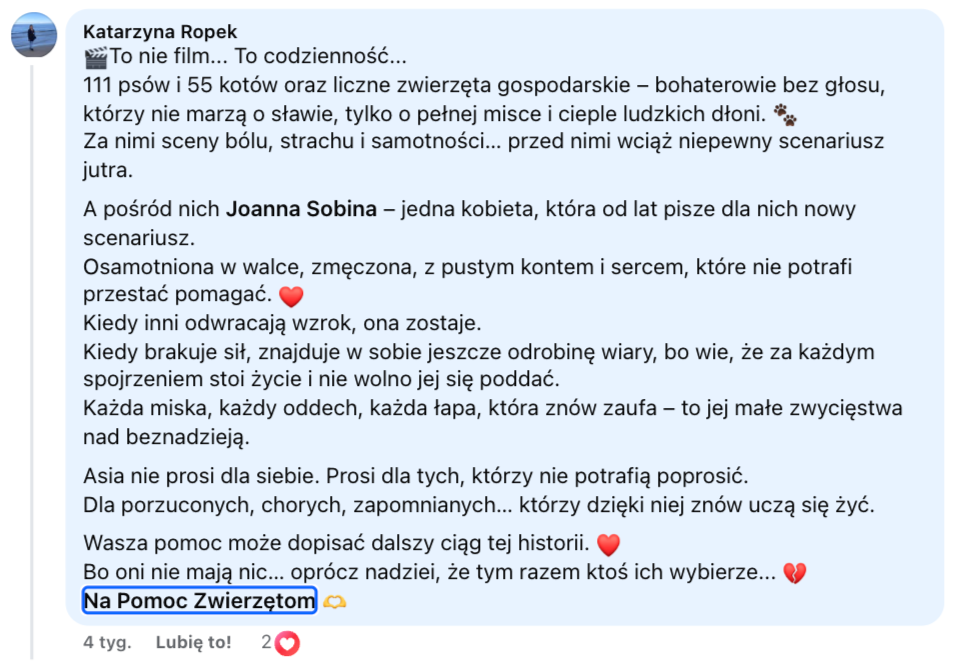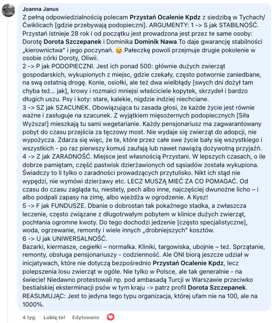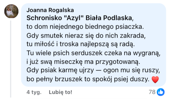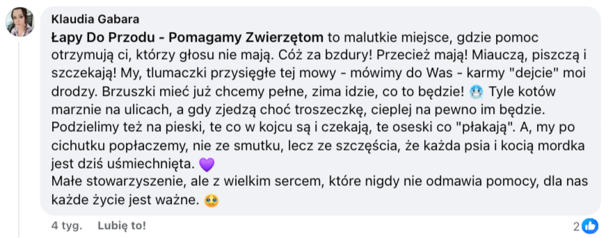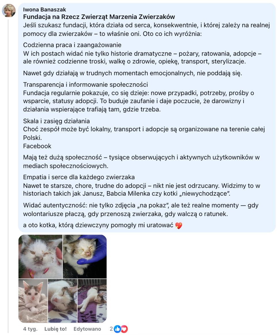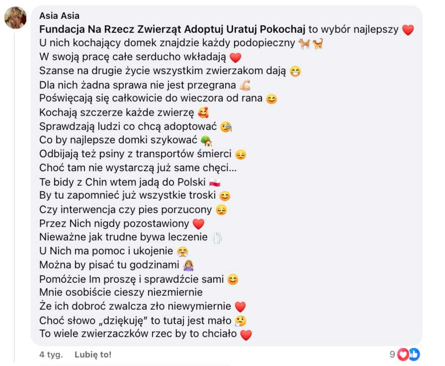 Fundacja "Na pomoc zwierzętom" - nie mogliśmy pozostać obojętni na tak ciepłe słowa o Pani Asi!