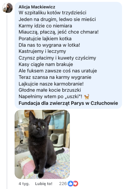 Fundacja Parys w Człuchowie - żeby na czynsz nie zabrakło, karma leci do Was.