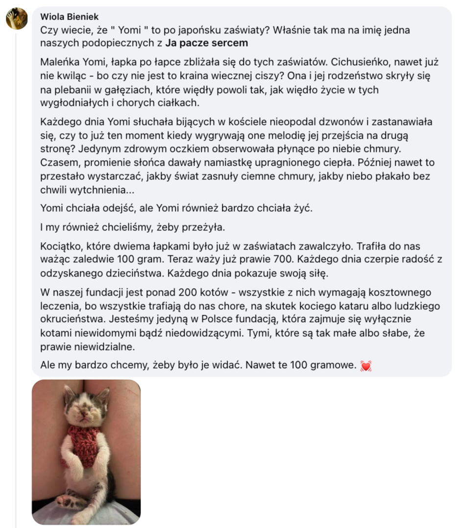 Ja Pacze Sercem" Fundacja Pomocy Kotom Niewidomym - dla kociaków takich jak Yomi, których większość życia była cierpieniem. Na lepszą przyszłość leci do Was karma!