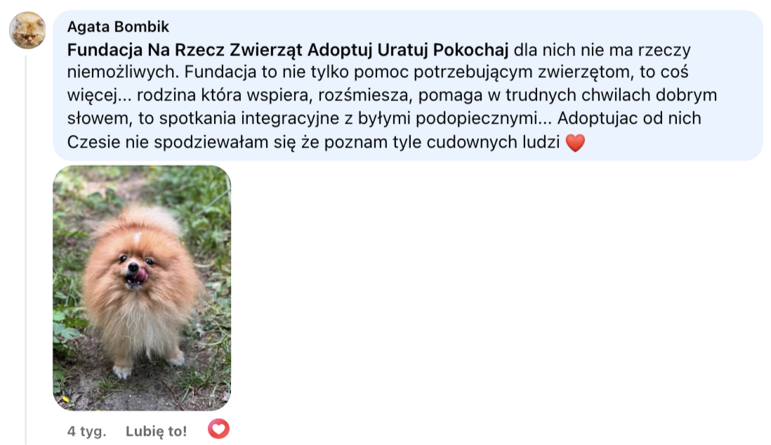 Fundacja Na Rzecz Zwierząt Adoptuj Uratuj Pokochaj - za stworzenie społeczności, która stoi za zwierzakami murem!
