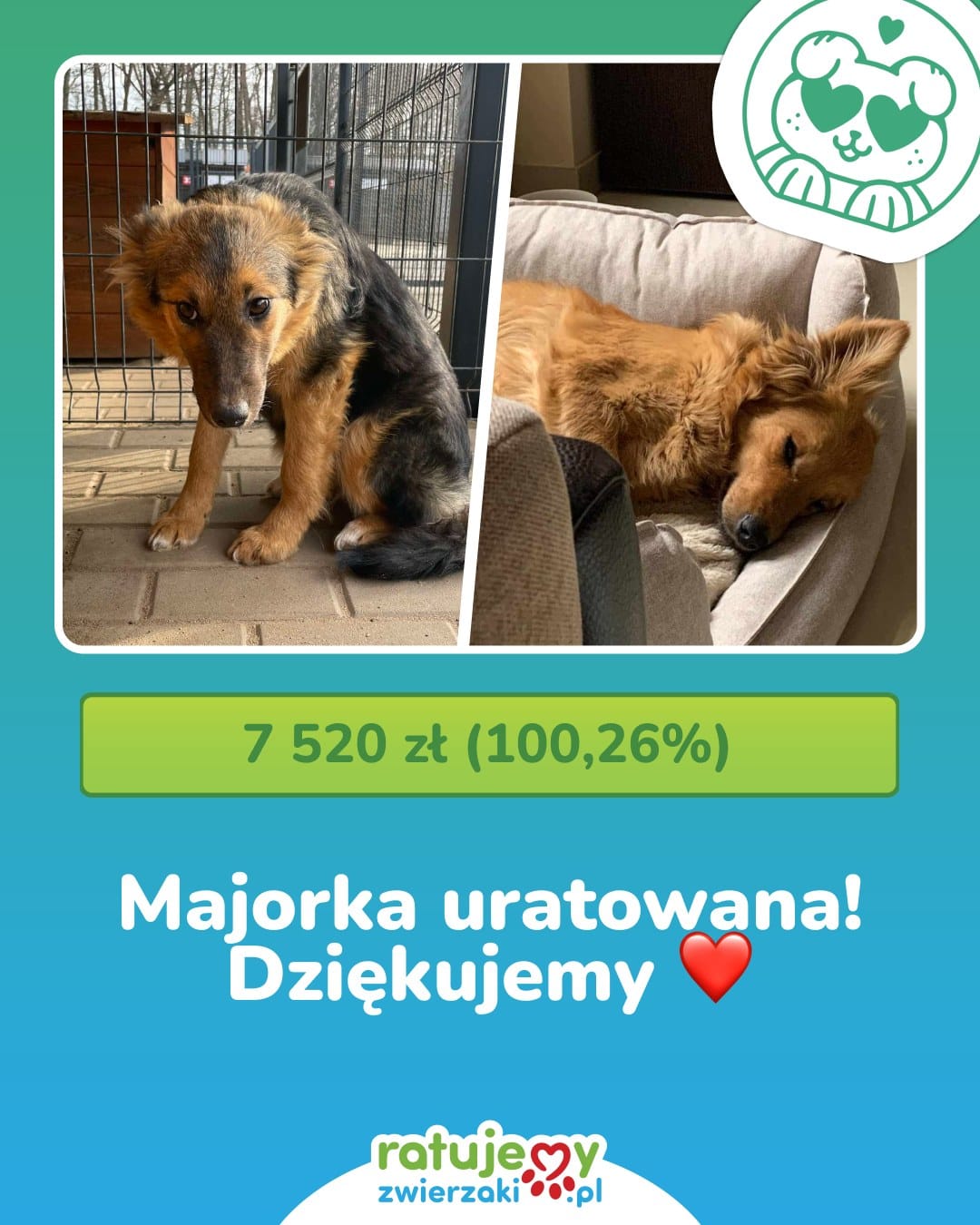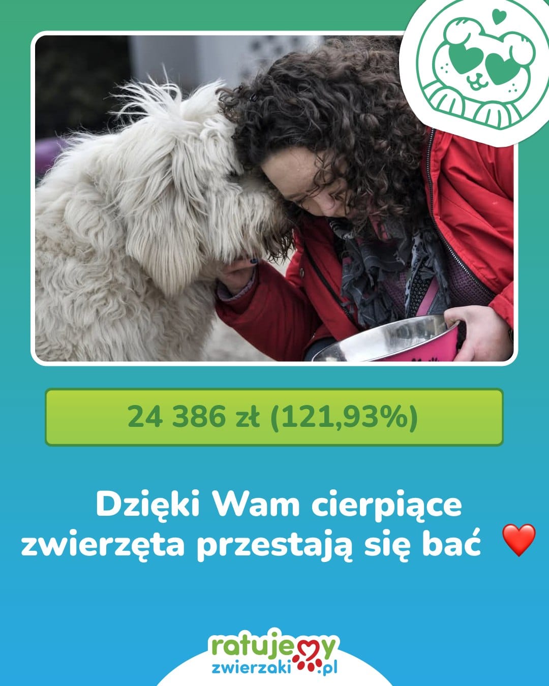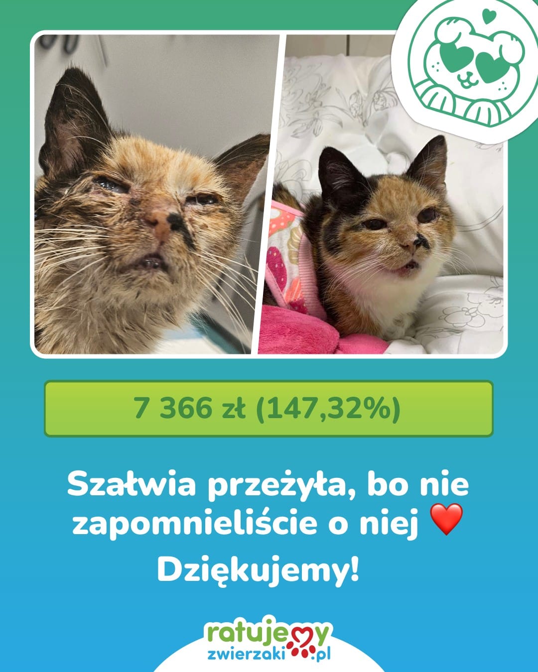 Wasze wpłaty, udostępnienia i dobre myśli pomogły opłacić leczenie chorych zwierząt z Łódzkiego Towarzystwa Opieki nad Zwierzętami, kupić specjalistyczną karmę i zapewnić im schronienie, kiedy najbardziej tego potrzebowały. To dzięki Wam Organizacje mogą reagować natychmiast – gdy pies wegetuje na łańcuchu, koty są zamknięte w piwnicy, a porzucone zwierzęta czekają na ratunek. Za każdą uratowaną łapkę – dziękujemy. Za to, że jesteście – dziękujemy!